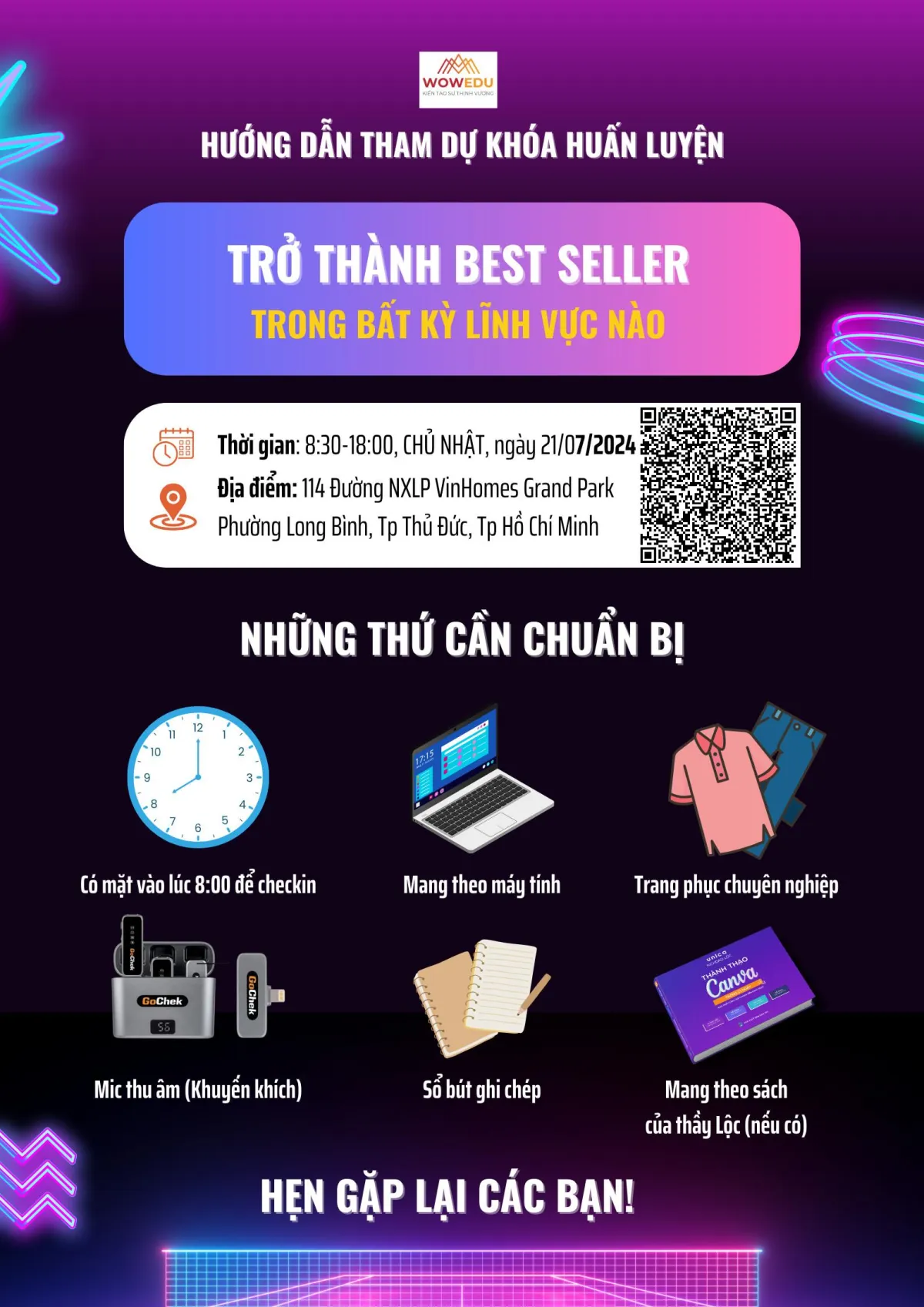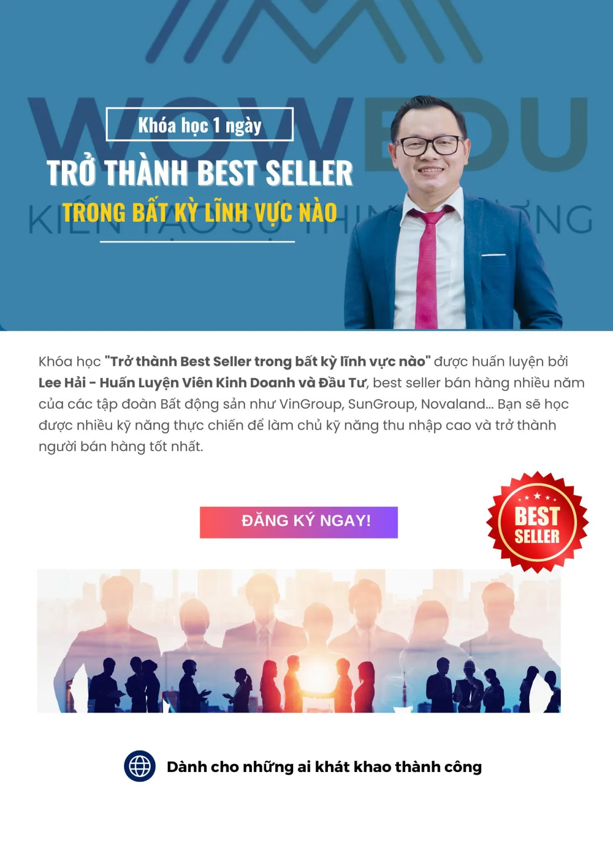 Khóa học "Trở Thành Best Seller Trong Bất Kỳ Lĩnh Vực Nào" đang mở cửa chào đón 50 học viên đầu tiên với mức giá ưu đãi chỉ 99k đồng thay vì 3 triệu đồng. Đừng bỏ lỡ cơ hội quý báu này để nâng cao kỹ năng bán hàng, tăng doanh số và xây dựng sự nghiệp thành công vượt bậc. Hành trình thay đổi cuộc đời bạn bắt đầu từ quyết định hôm nay. Đăng ký ngay để không bỏ lỡ!